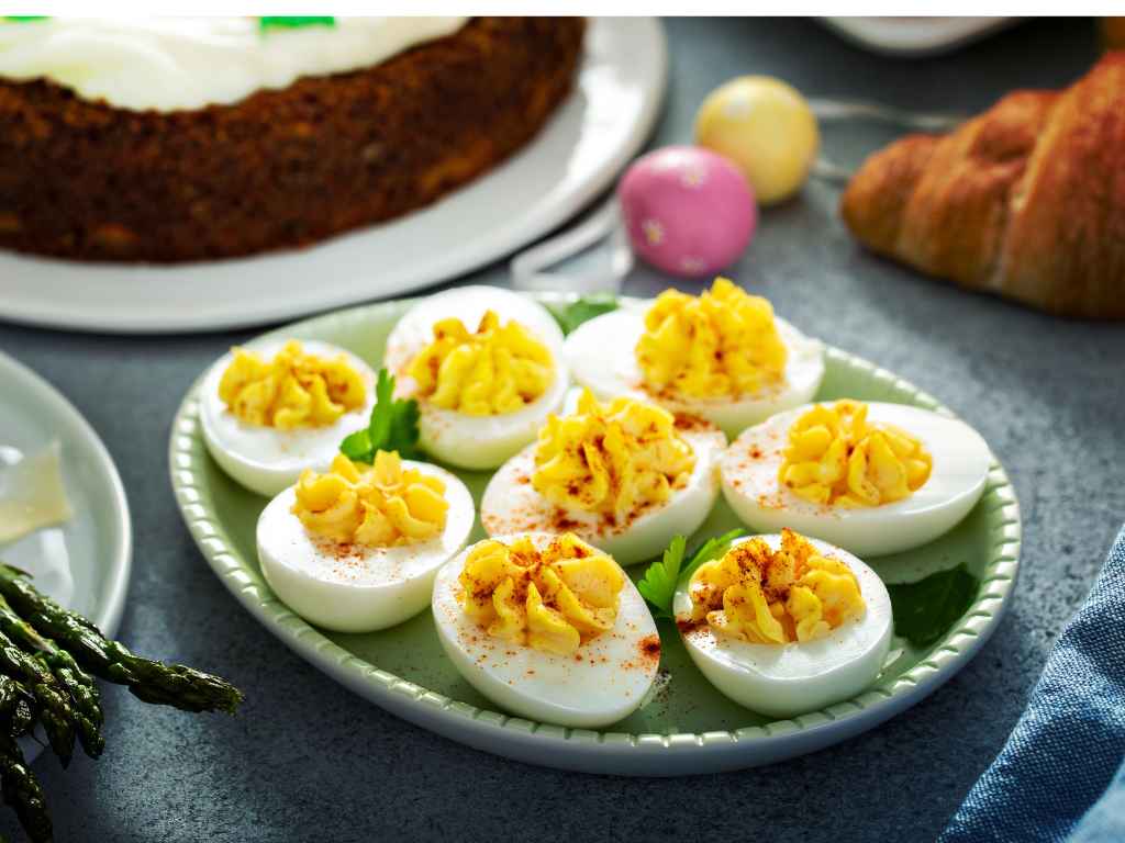 定番はハム料理や卵を使った料理(デビルドエッグなど)。さらに、うさぎや卵の形をしたチョコレートも多く、子どもたちに人気です。